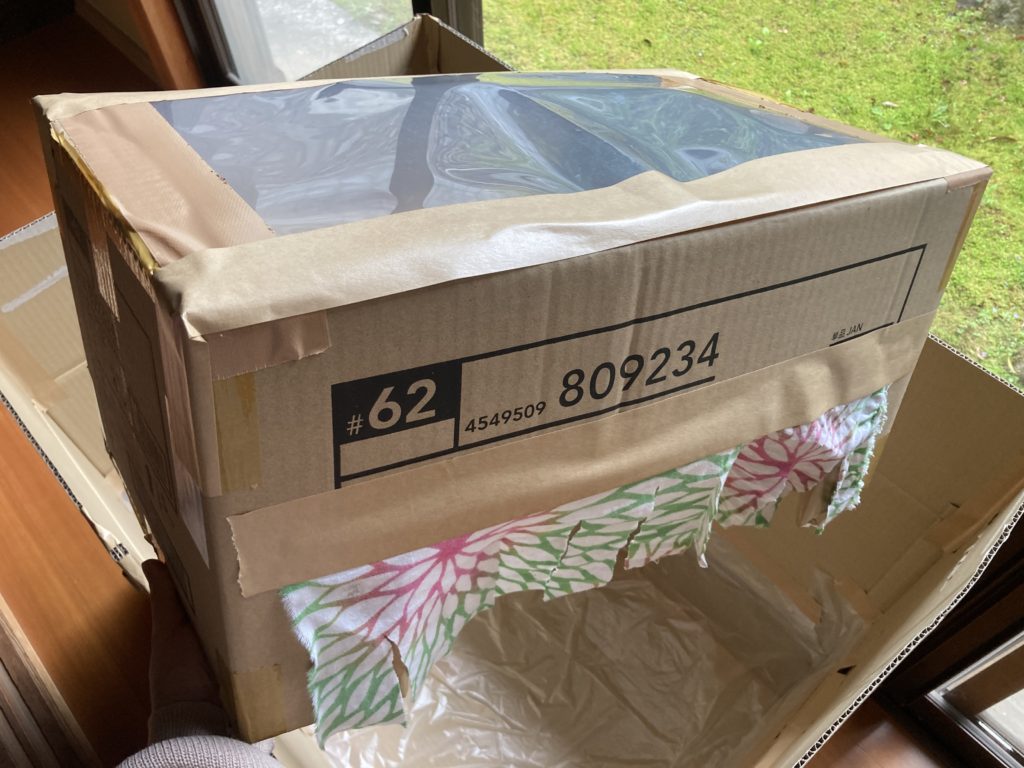 うちではダンボールとクリアファイルで、ヒヨコ電球の入った温室を作って