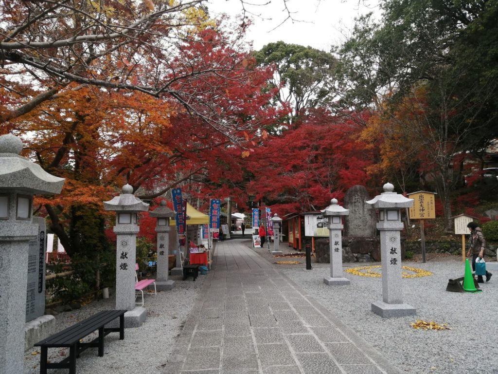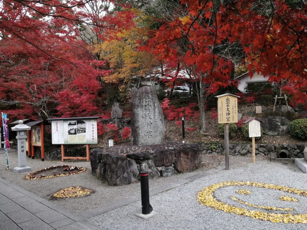 亀岡市、千歳町。元出雲として知られる出雲大神宮。紅葉するとカラフルになる山全体が霊場となっていて、プチハイキングも楽しいです。落ち葉アートもかわいい。
